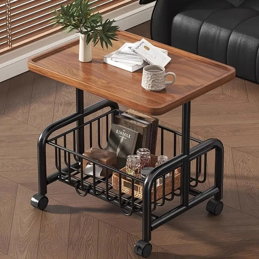 Table Basse Vintage Mobile en Bois Dur avec Rangement à Deux Niveaux