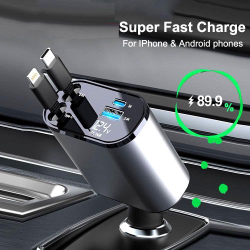 Chargeur de Voiture Rétractable 4-en-1 120W avec Câbles Lightning & USB-C