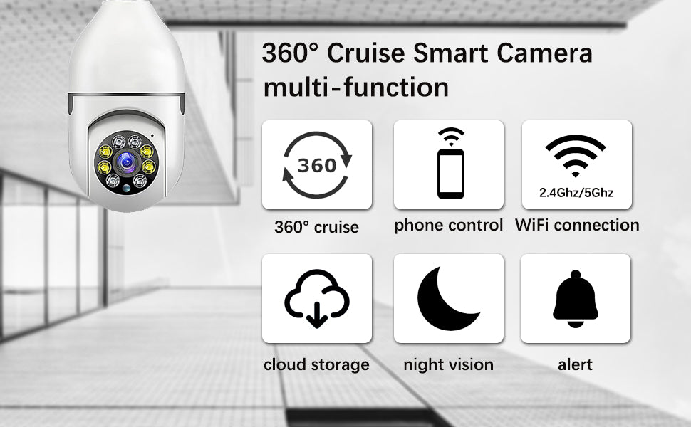 Assurez la sécurité de votre maison 24h/24 grâce à notre caméra ampoule IP-WiFi FULL HD 1080P à rotation motorisée. Offrant une vue panoramique à 360° et un accès à distance via smartphone ou tablette, elle vous permet de surveiller en temps réel votre domicile, votre famille et vos animaux de compagnie, où que vous soyez.