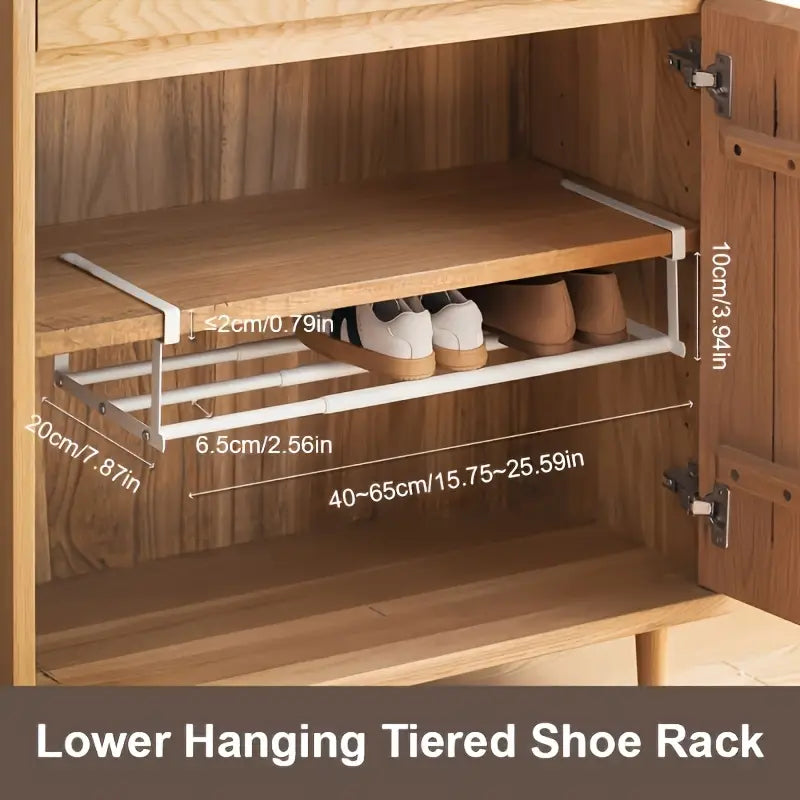 Maximisez votre espace avec cette étagère suspendue extensible, parfaite pour organiser vos affaires dans la cuisine, la salle de bain, le dressing ou même le meuble à chaussures. Conçue pour se fixer sous une étagère existante sans perçage, elle ajoute instantanément un niveau de rangement supplémentaire.
