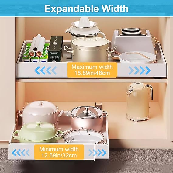 Utilisation Polyvalente : Idéal pour les placards de cuisine, salles de bains, placards et même bureaux, cet organisateur extensible aide à maximiser l’espace de rangement tout en maintenant un environnement ordonné. Convient aux placards d'une largeur minimale de 48 cm et d'une profondeur de 42 cm.
