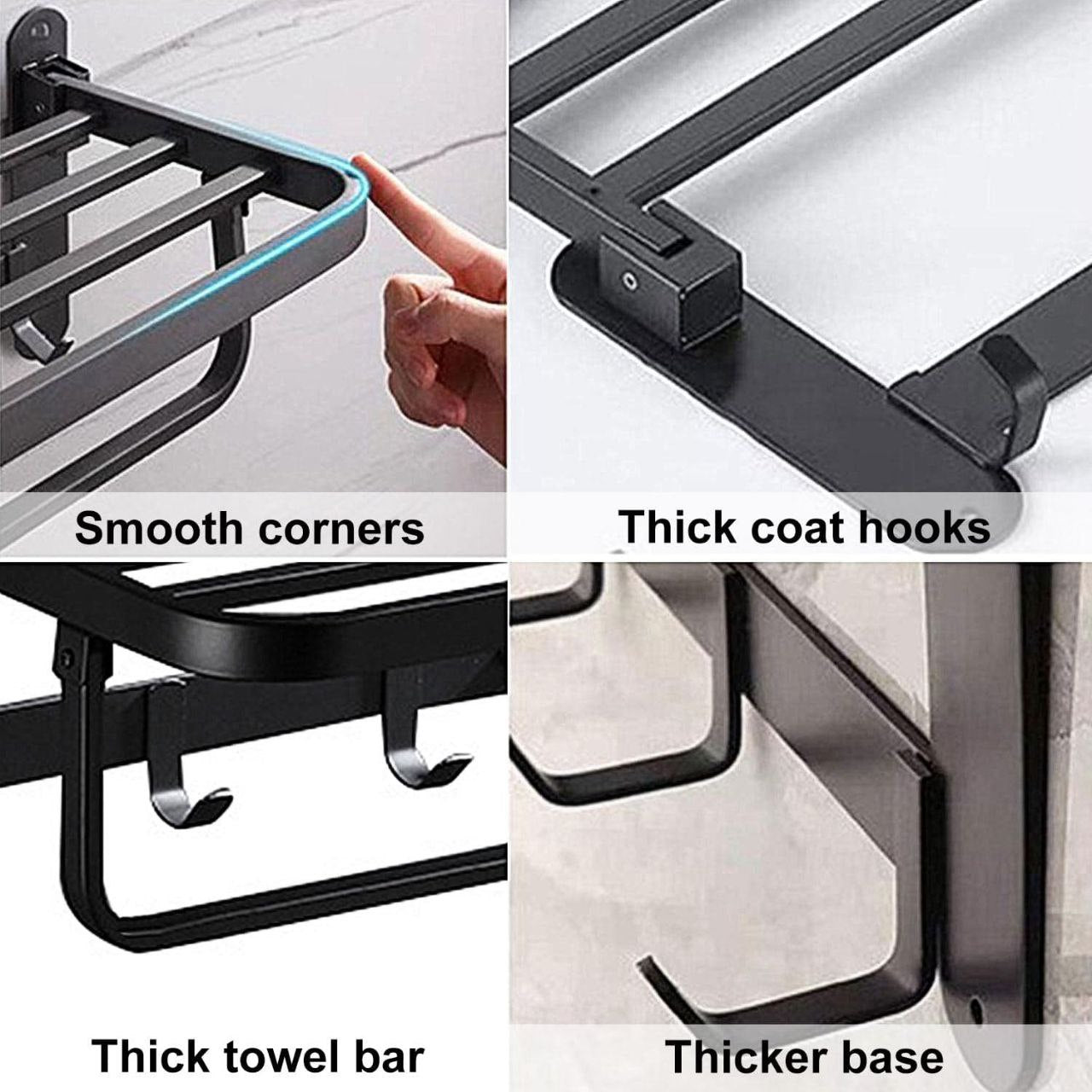 Porte-serviettes mural en aluminium noir mat avec étagère et 7 crochets
