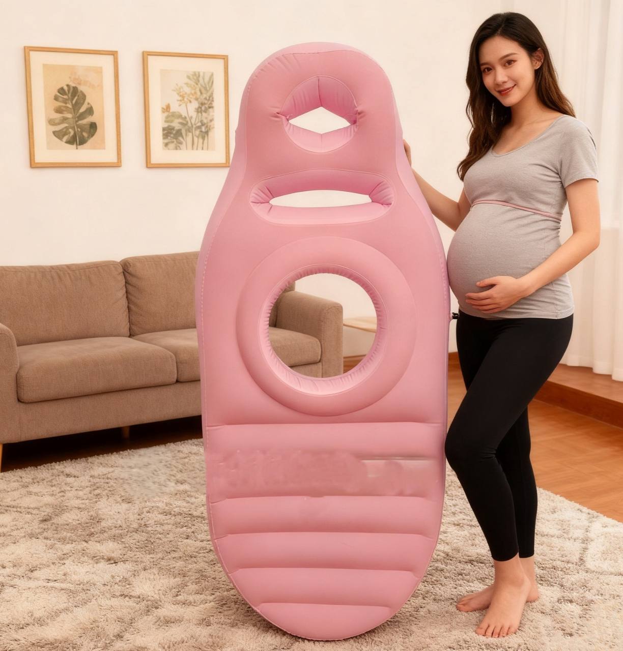 Cet oreiller gonflable est spécialement conçu pour les femmes enceintes, avec des ouvertures pour le ventre et la tête afin de s’allonger confortablement sans الضغط ni gêne.